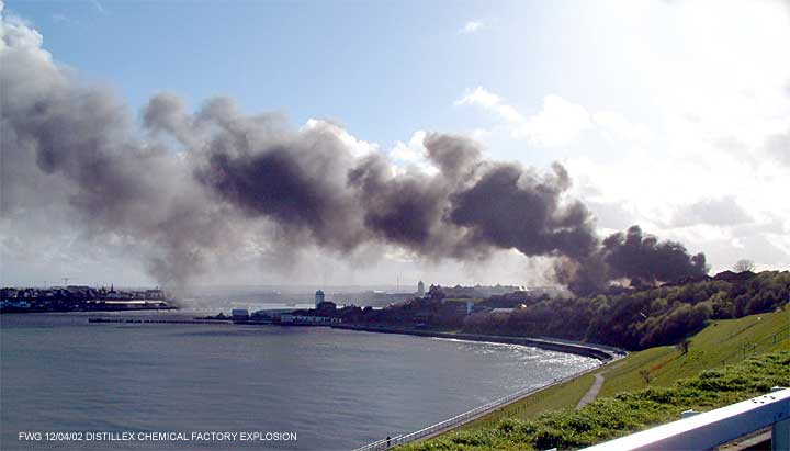 Distillex Chemical Factory Explosion. Plumes of acrid black smoke fill the air.