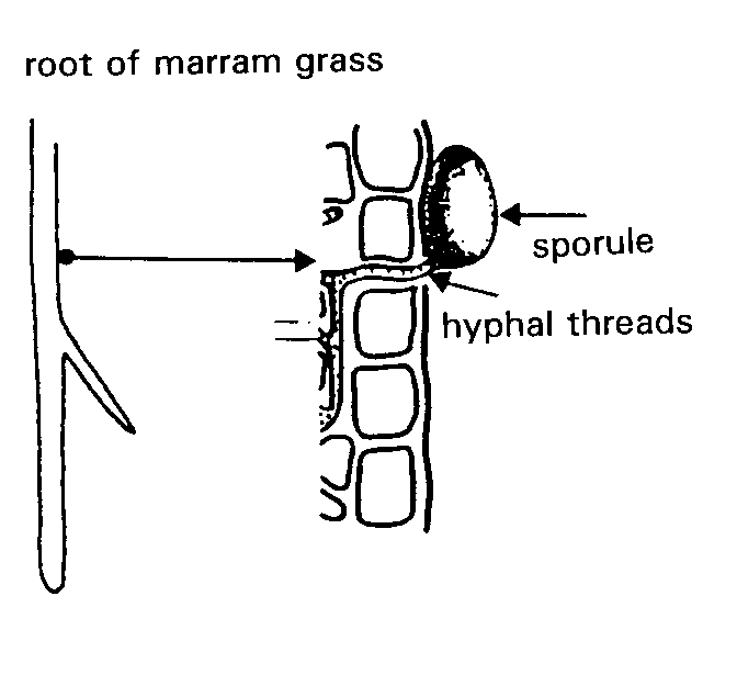 | The fungus is then able to enter into the root system through the damage point with its hyphal threads. The nematodes are only able to climb to the new roots during a certain period of the year. In early spring Marram Grass is able to form new roots in the fresh sand before the arrival of the nematodes. In this way the Marram Grass survives the attack of the nematodes and the fungi. | ![]() |