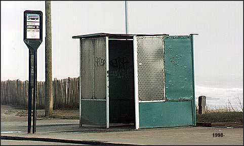 In the foreground an elegantly designed and well maintained bus shelter